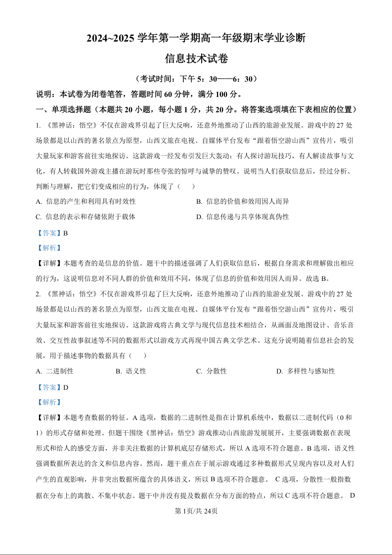 山西省太原市2024-2025学年上学期1月高一期末考试技术(精品解析版)