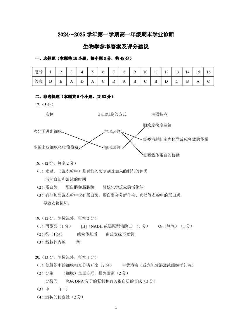 山西省太原市2024-2025学年上学期1月高一期末考试生物答案