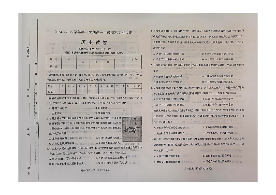 山西省太原市2024-2025学年上学期1月高一期末考试历史