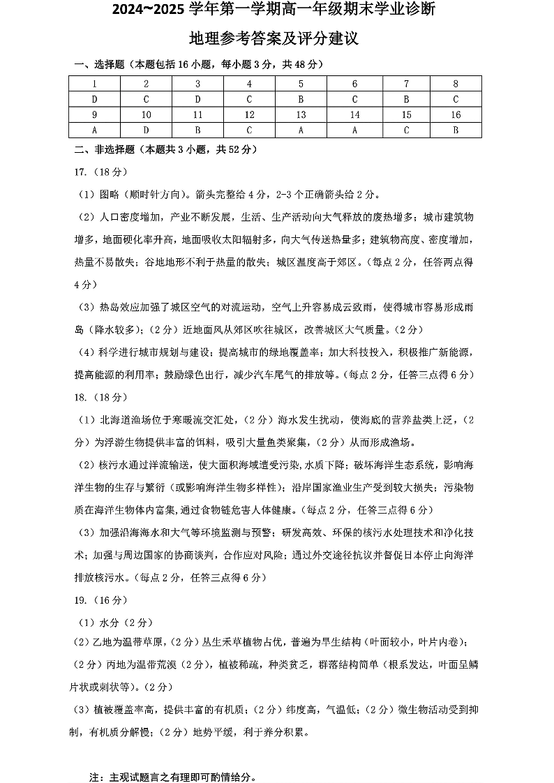 山西省太原市2024-2025学年上学期1月高一期末考试地理答案