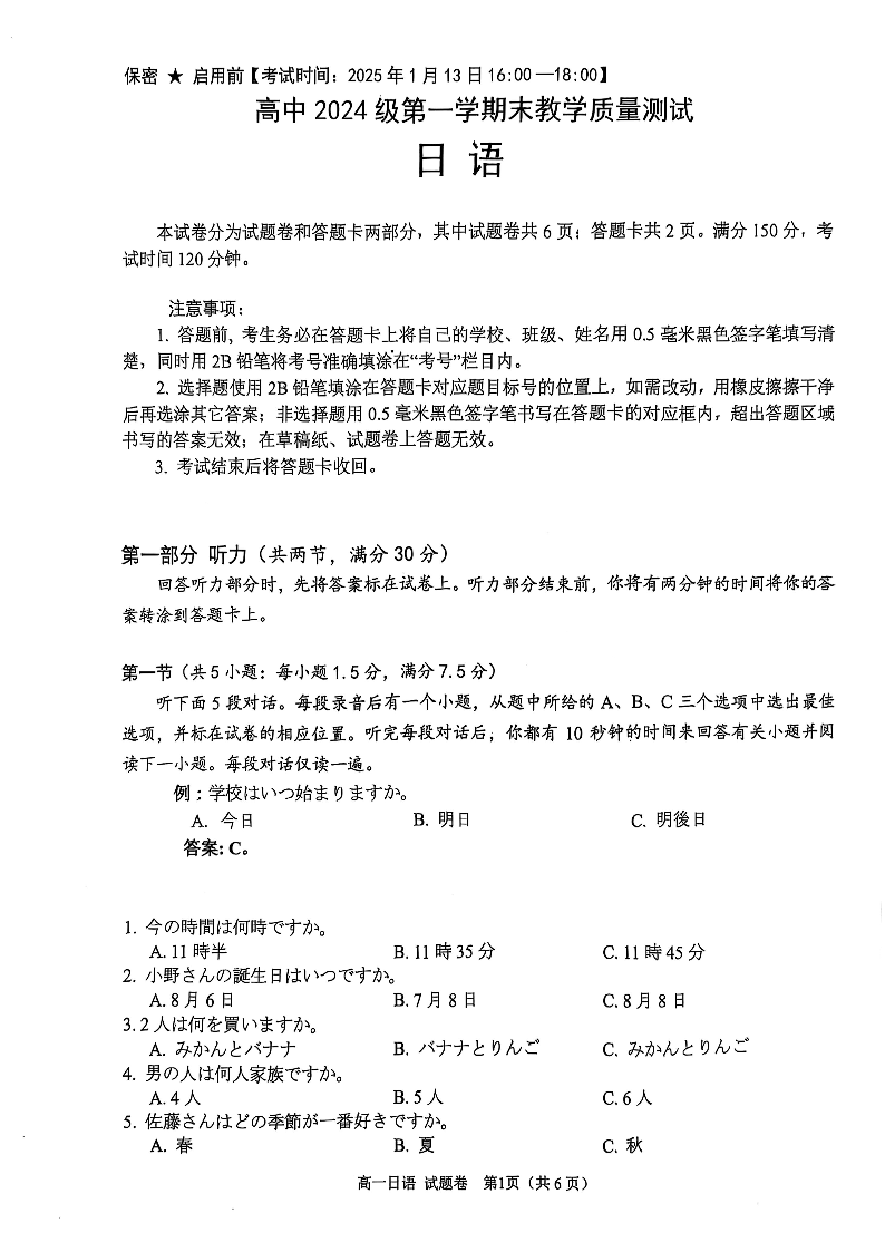 四川省绵阳市2024-2025学年上学期1月高一期末教学质量测试日语