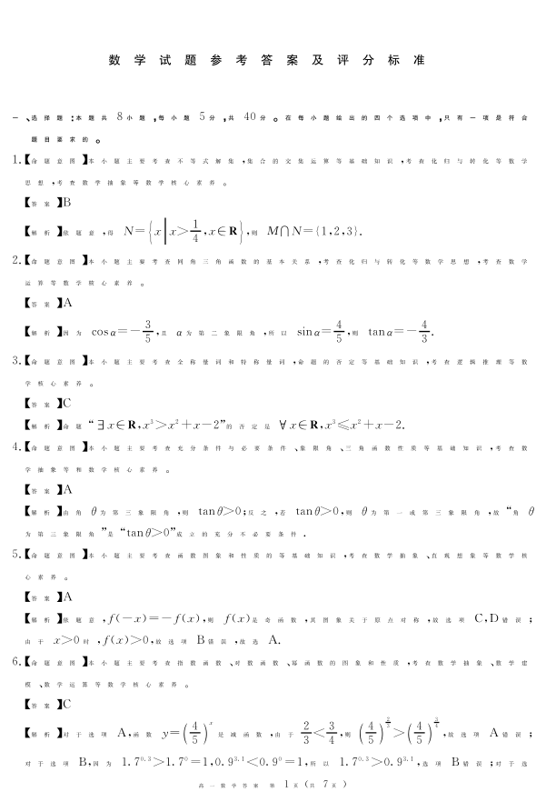 四川省遂宁市2024-2025学年上学期1月高一期末考试数学答案