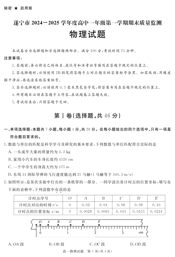 四川省遂宁市2024-2025学年上学期1月高一期末考试物理