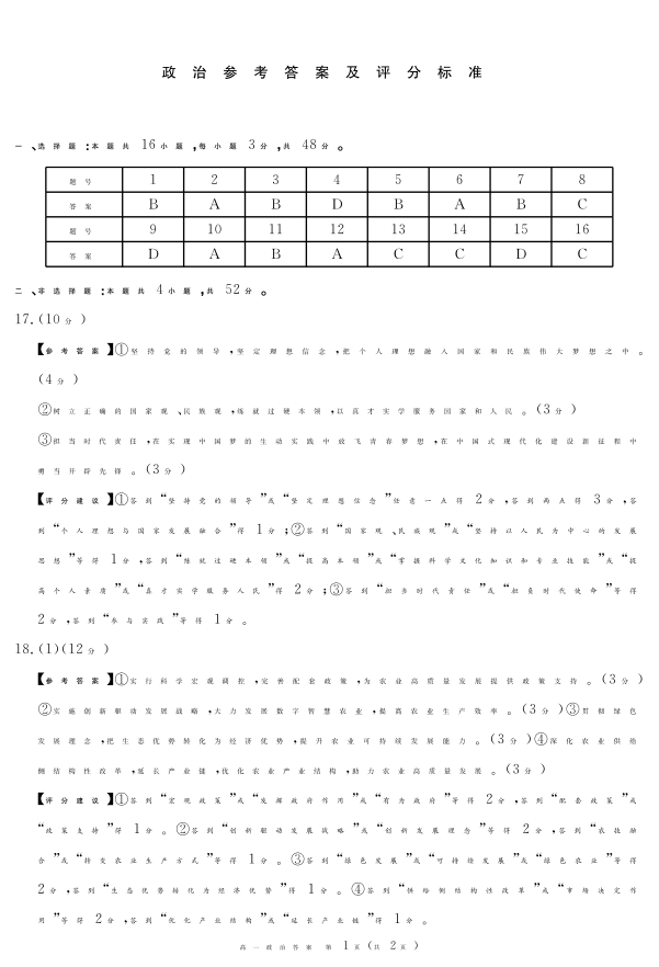 四川省遂宁市2024-2025学年上学期1月高一期末考试政治答案