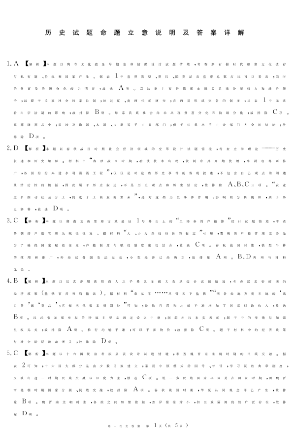 四川省遂宁市2024-2025学年上学期1月高一期末考试历史答案