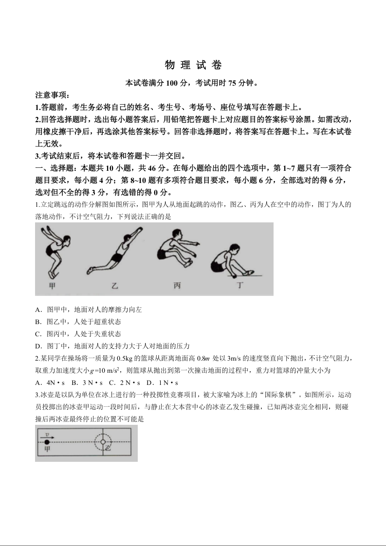 辽宁省抚顺市省重点高中六校协作体2025届高三上学期1月期末考试(二模)物理+答案
