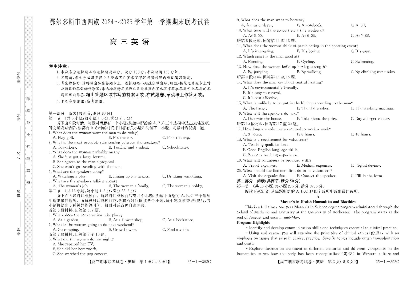 内蒙古鄂尔多斯市西四旗2024-2025学年上学期1月高三期末联考英语+答案