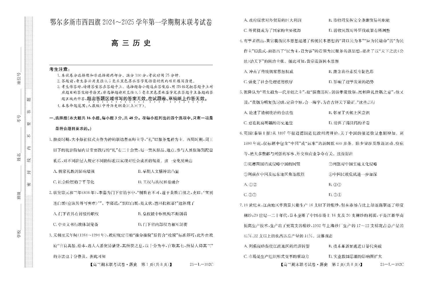 内蒙古鄂尔多斯市西四旗2024-2025学年上学期1月高三期末联考历史+答案