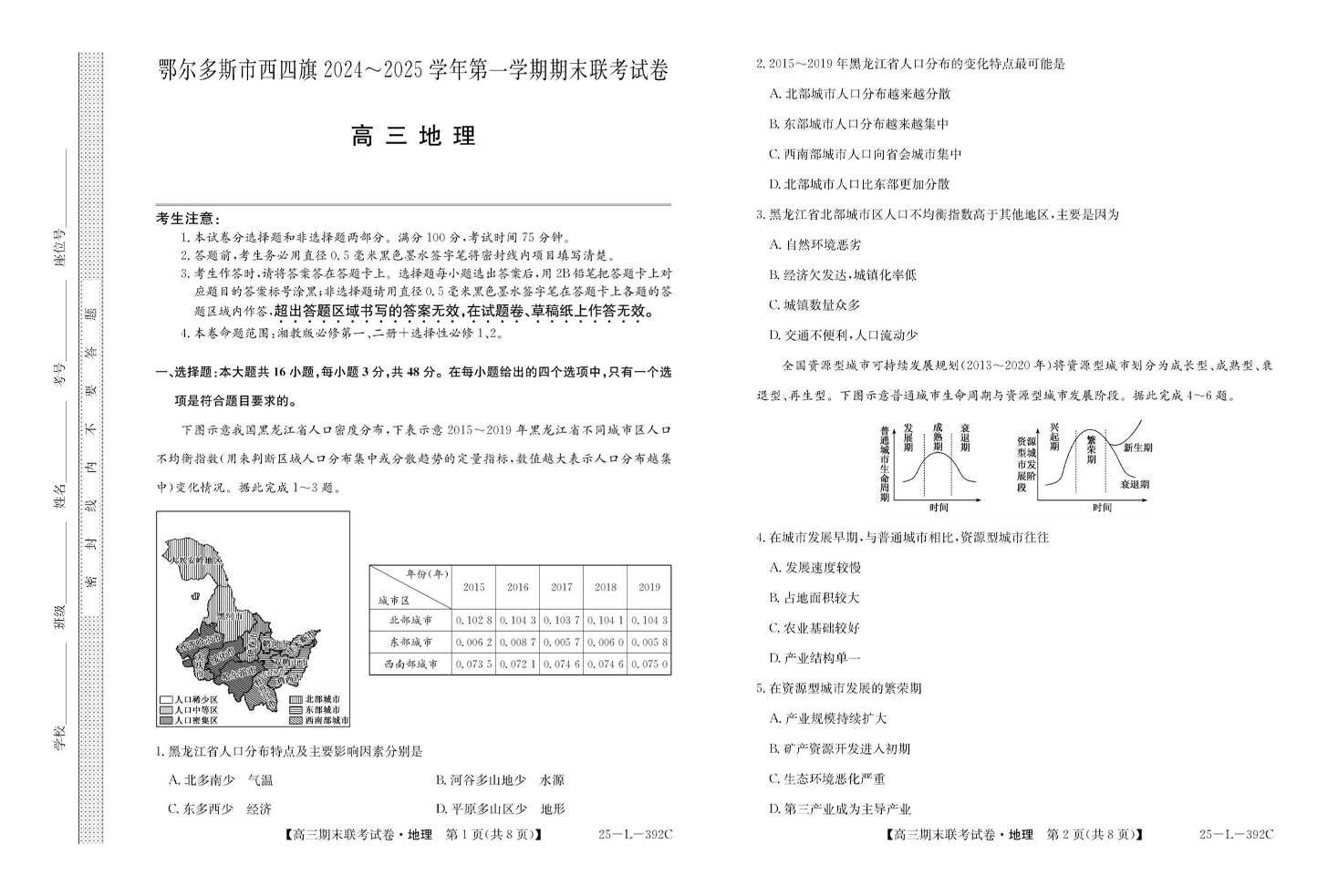 内蒙古鄂尔多斯市西四旗2024-2025学年上学期1月高三期末联考地理+答案