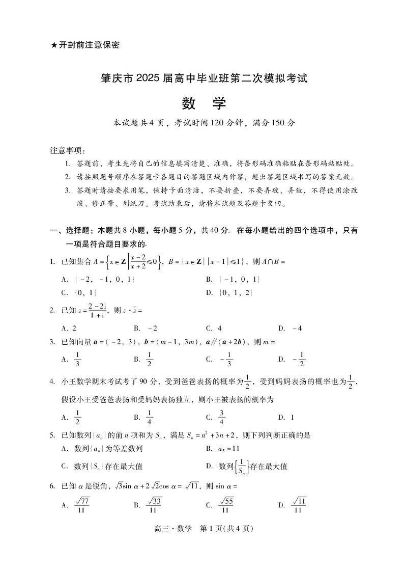 广东省肇庆市2024-2025学年上学期高三第二次模拟考试(期末)数学+答案