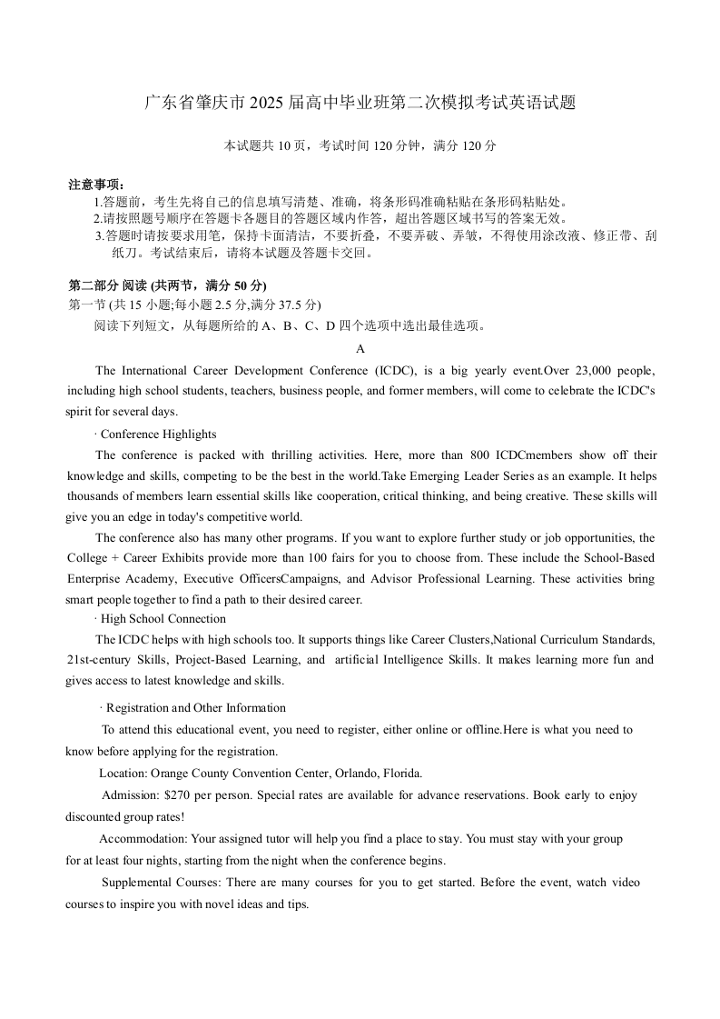 广东省肇庆市2024-2025学年上学期高三第二次模拟考试(期末)英语+答案