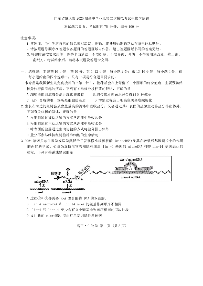 广东省肇庆市2024-2025学年上学期高三第二次模拟考试(期末)生物+答案