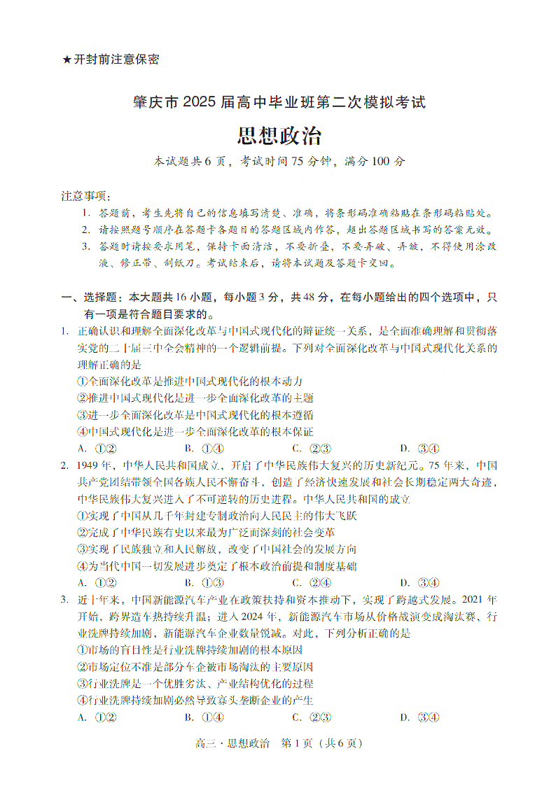 广东省肇庆市2024-2025学年上学期高三第二次模拟考试(期末)政治+答案