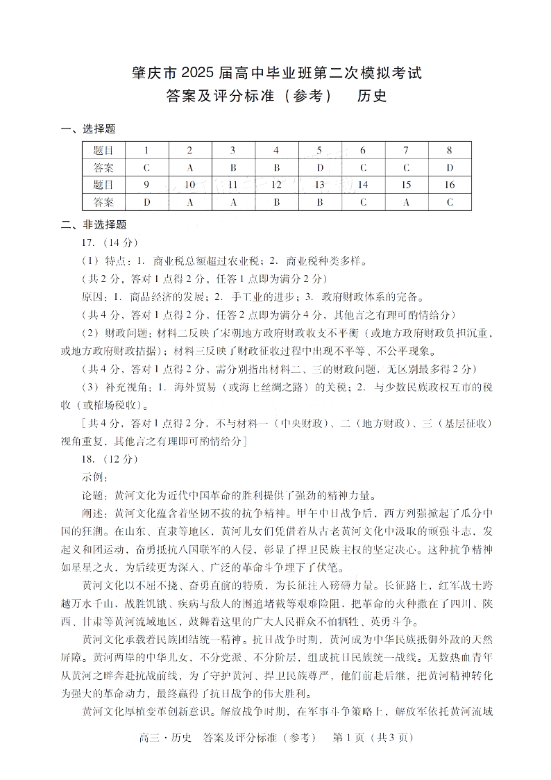 广东省肇庆市2024-2025学年上学期高三第二次模拟考试(期末)历史答案