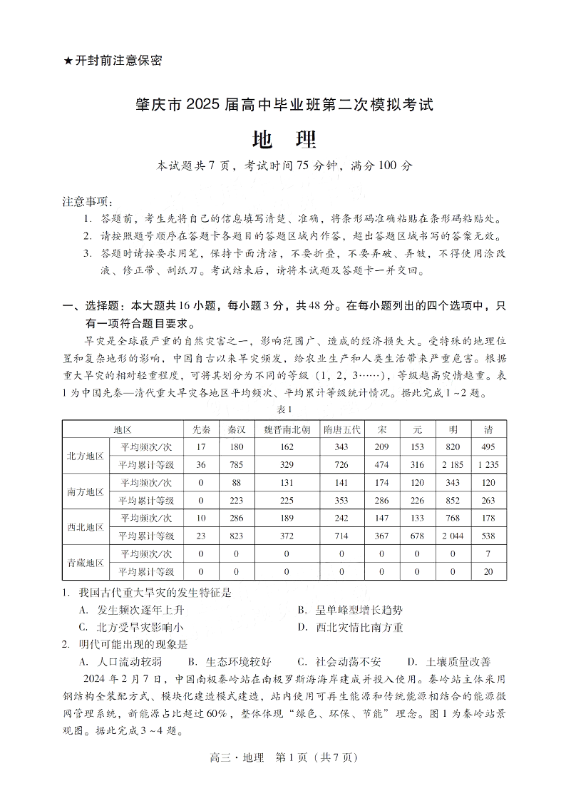 广东省肇庆市2024-2025学年上学期高三第二次模拟考试(期末)地理+答案