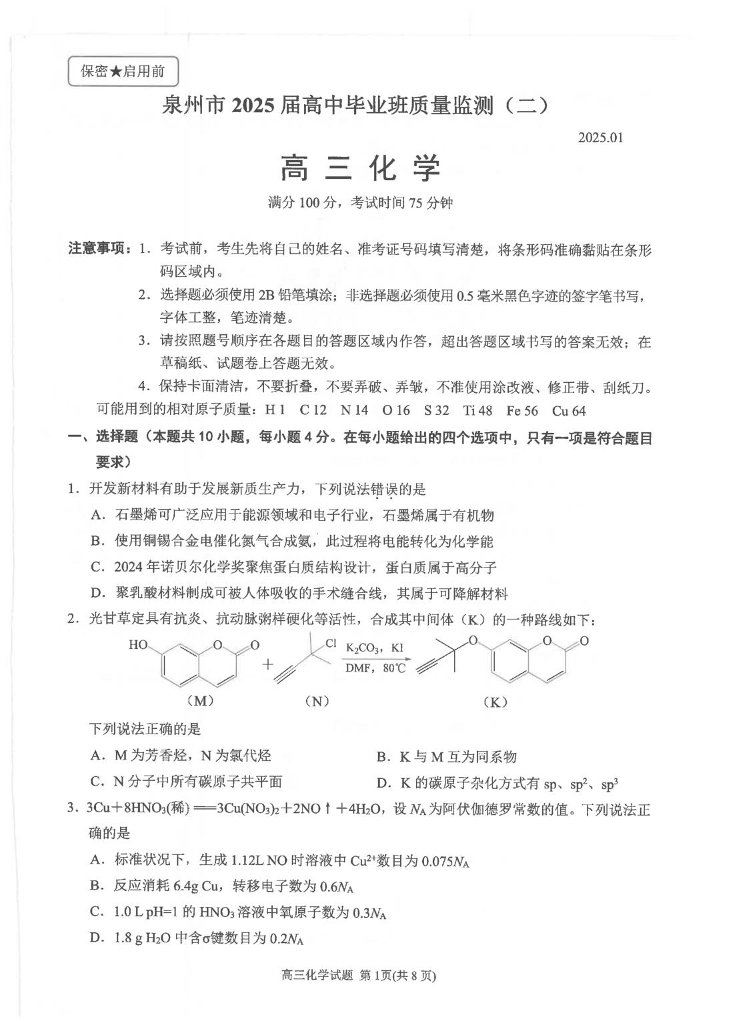 福建省泉州市2024-2025学年上学期高中毕业班质量监测(二)化学