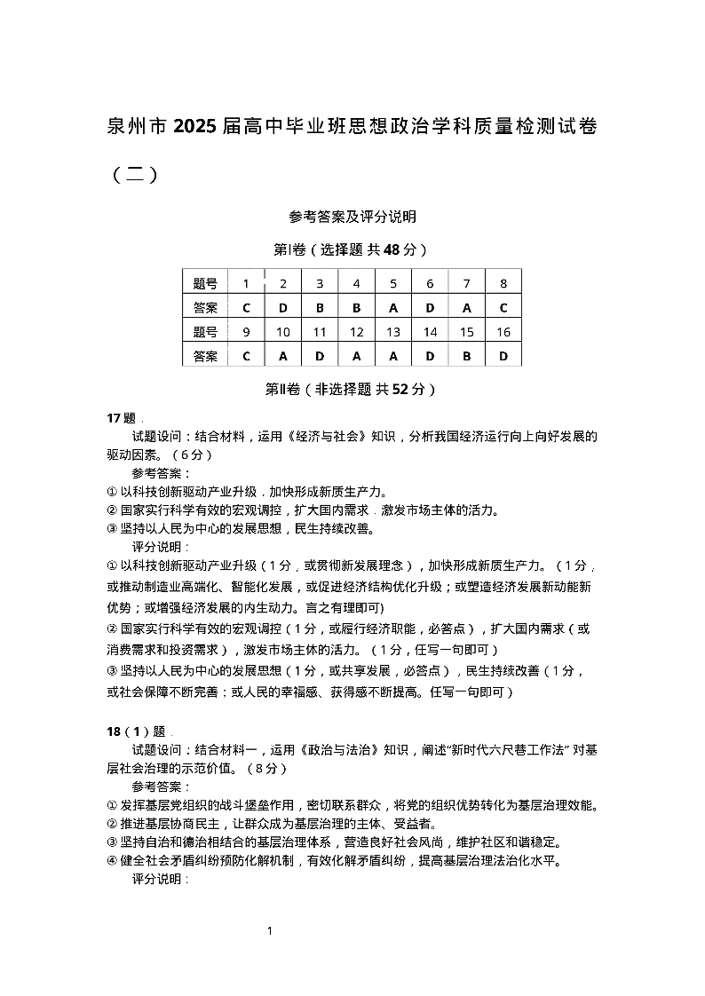 福建省泉州市2024-2025学年上学期高中毕业班质量监测(二)政治答案
