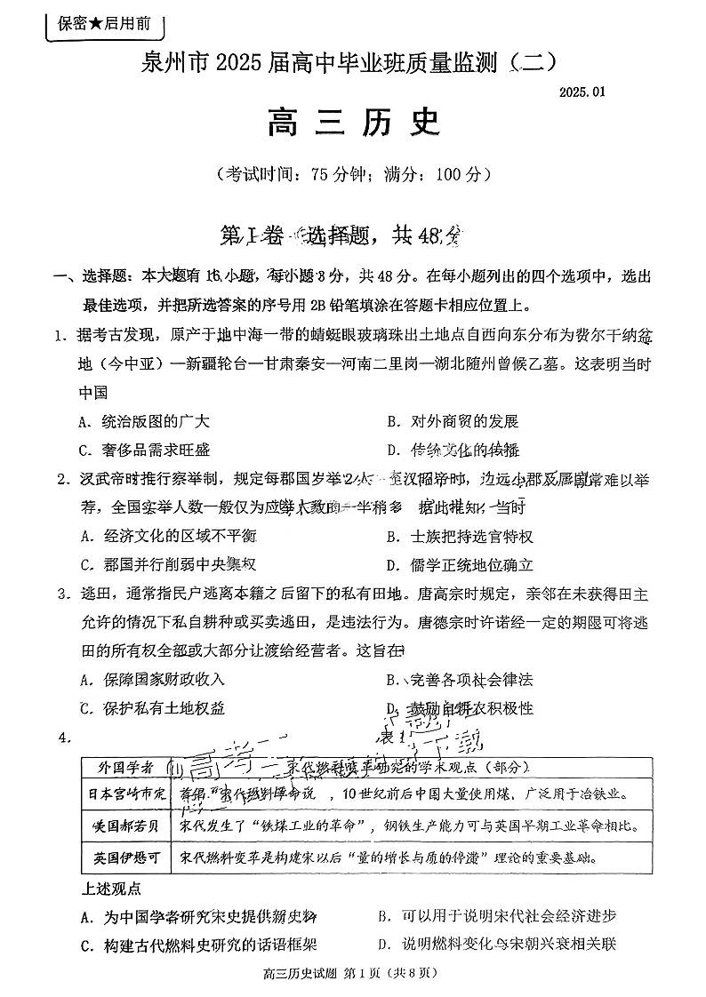 福建省泉州市2024-2025学年上学期高中毕业班质量监测(二)历史