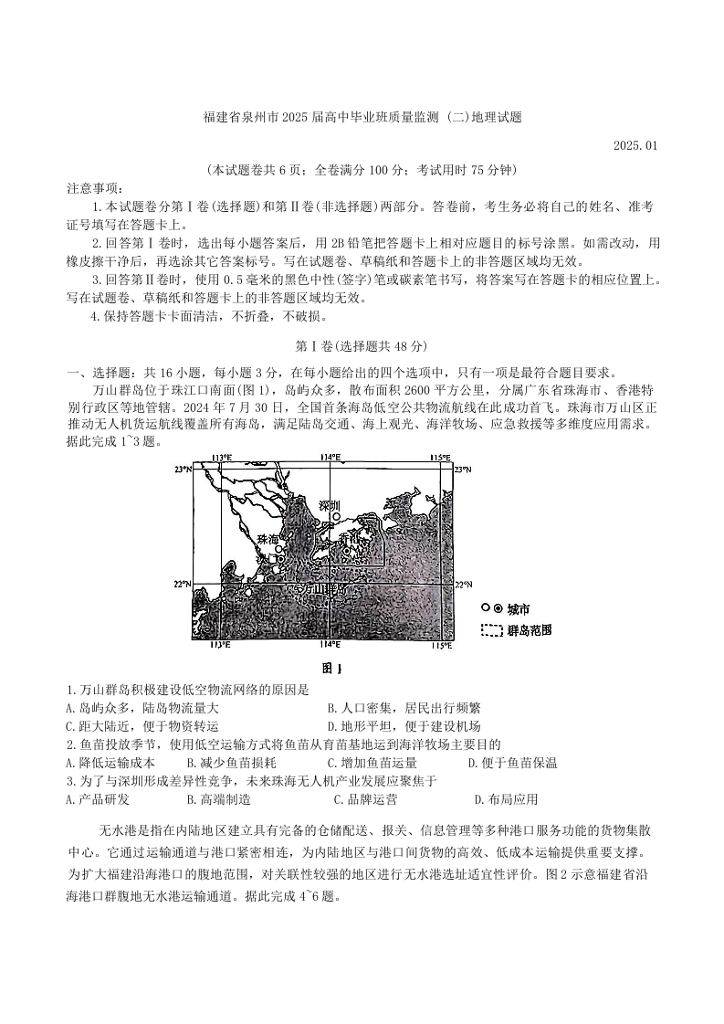 福建省泉州市2024-2025学年上学期高中毕业班质量监测(二)地理+答案