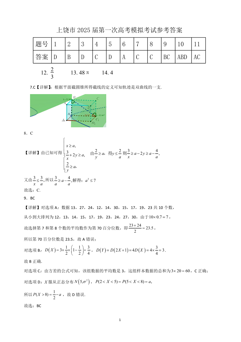 江西省上饶市2024-2025学年上学期1月高三第一次高考模拟考试数学答案