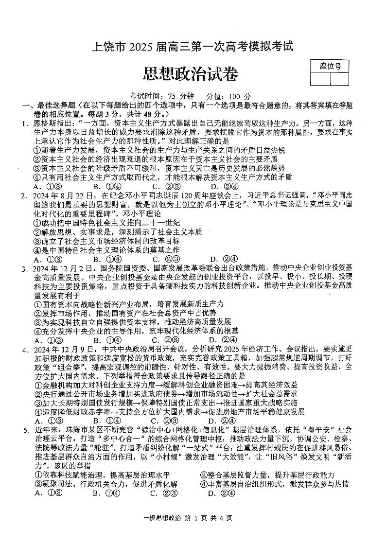 江西省上饶市2024-2025学年上学期1月高三第一次高考模拟考试政治