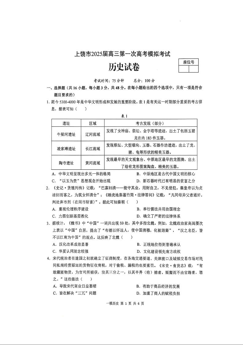 江西省上饶市2024-2025学年上学期1月高三第一次高考模拟考试历史