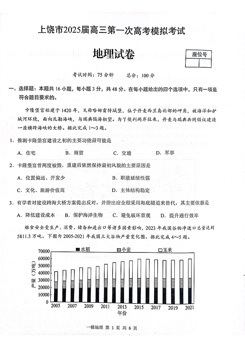 江西省上饶市2024-2025学年上学期1月高三第一次高考模拟考试地理