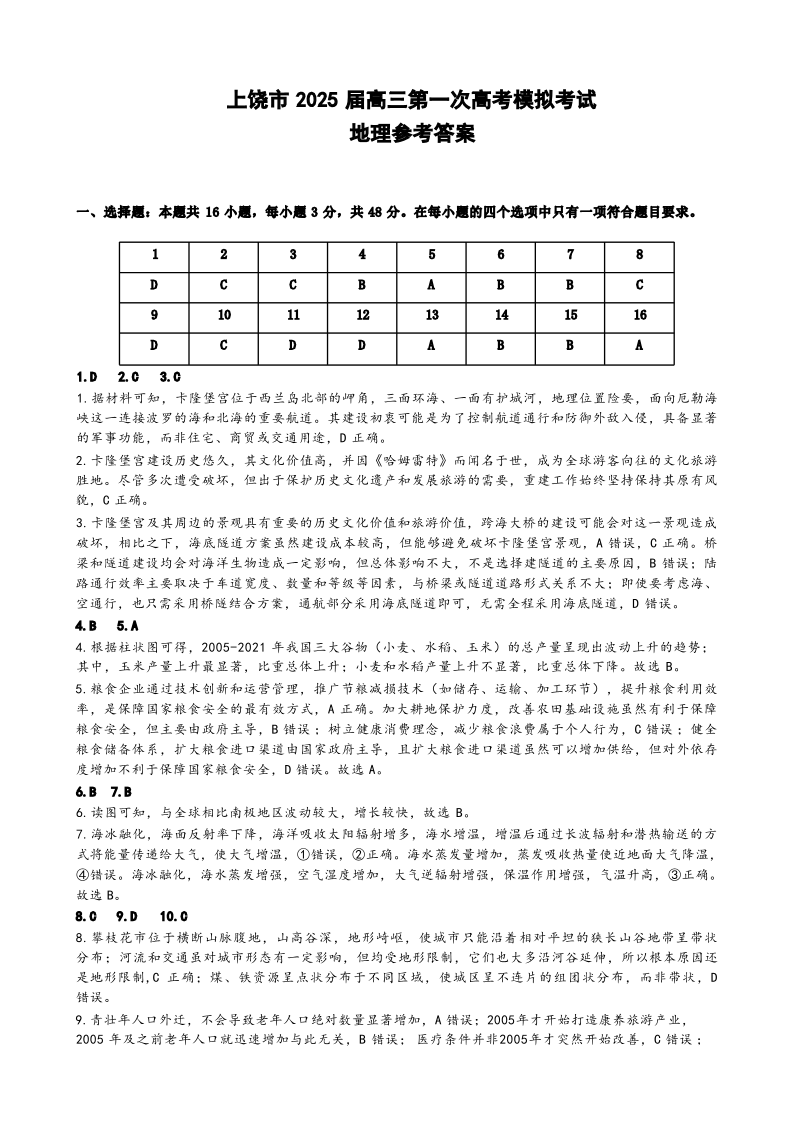 江西省上饶市2024-2025学年上学期1月高三第一次高考模拟考试地理答案
