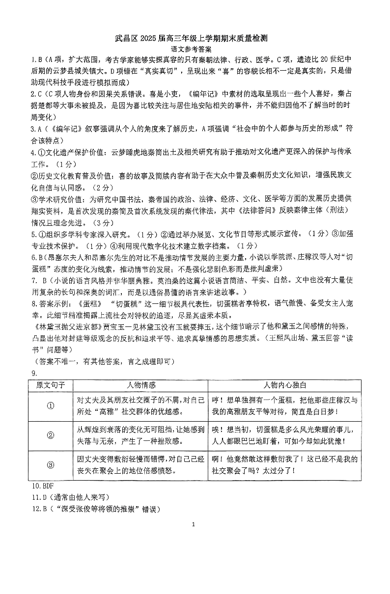 湖北省武汉市武昌区2024-2025学年上学期1月高三期末质量检测语文答案