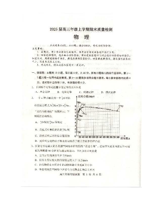 湖北省武汉市武昌区2024-2025学年上学期1月高三期末质量检测物理