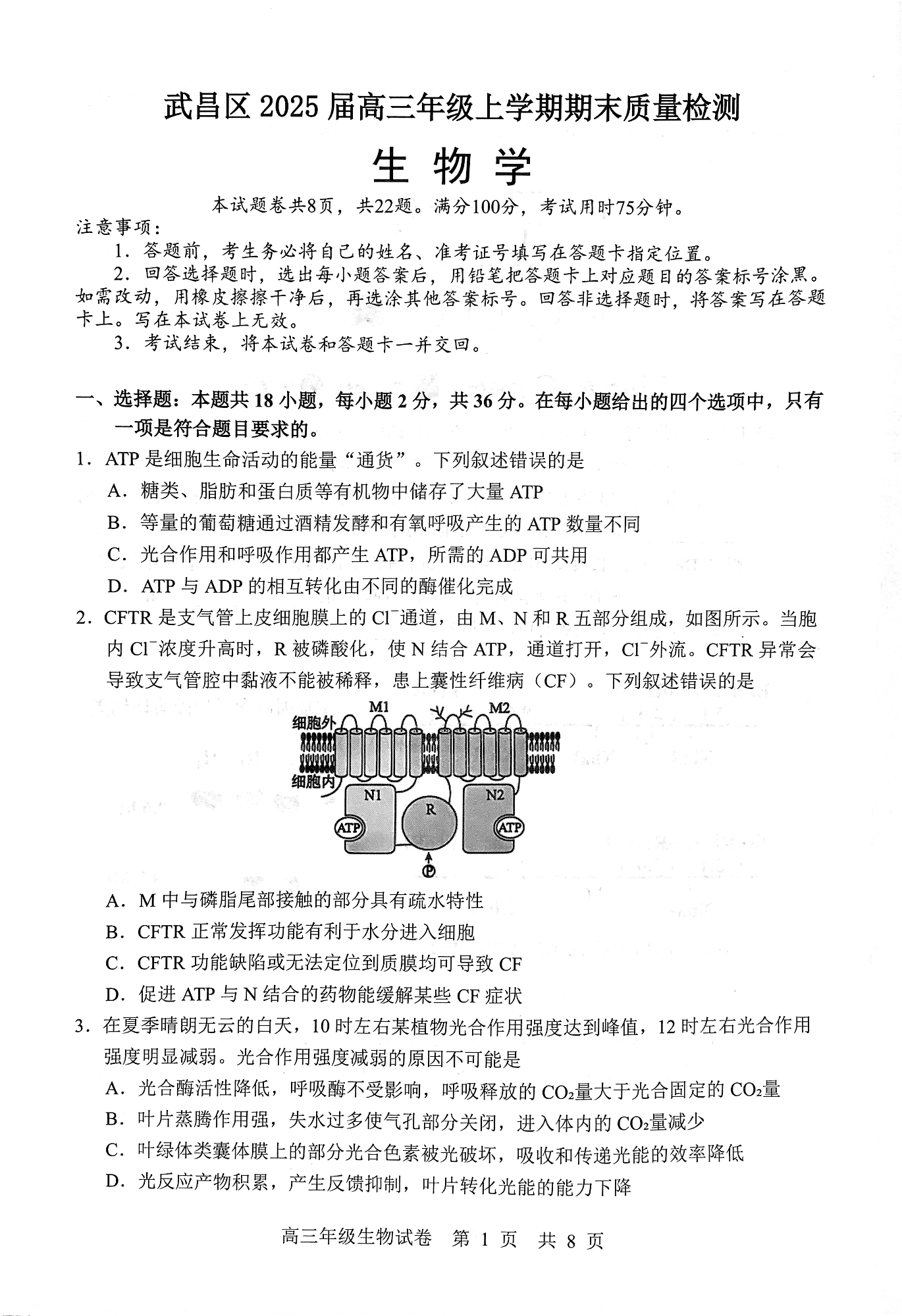 湖北省武汉市武昌区2024-2025学年上学期1月高三期末质量检测生物