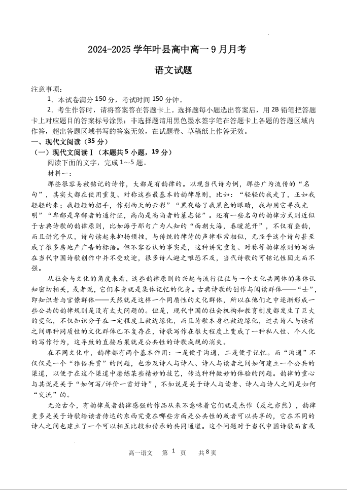 河南省平顶山市2024-2025学年叶县高中高一9月月考语文