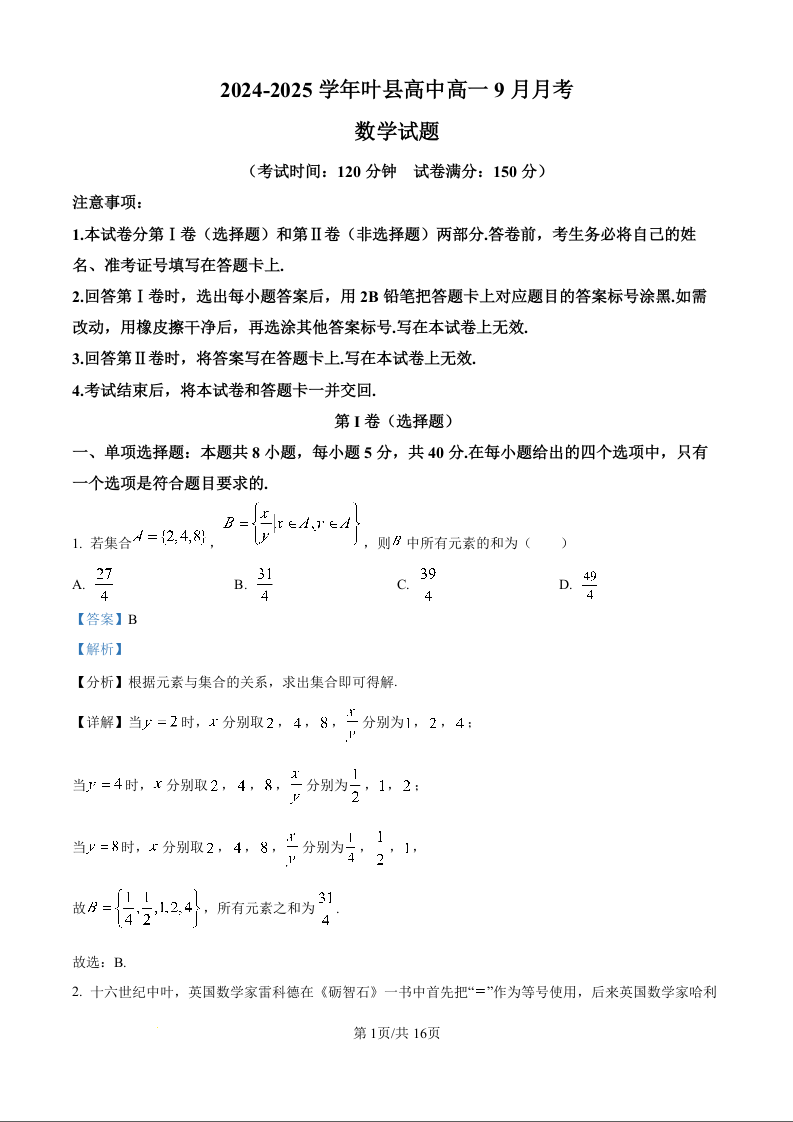 河南省平顶山市2024-2025学年叶县高中高一9月月考数学(解析版)