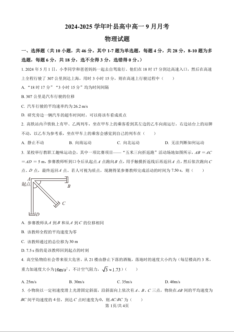 河南省平顶山市2024-2025学年叶县高中高一9月月考物理(原卷版)