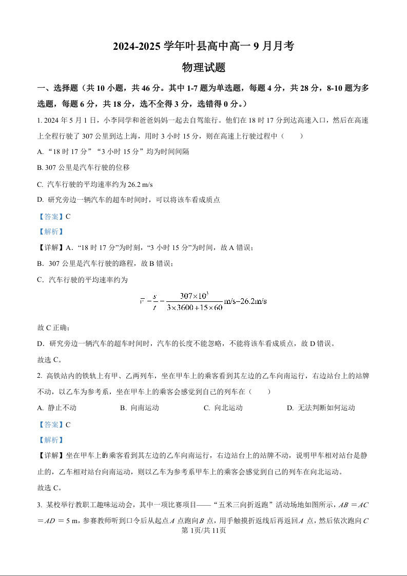 河南省平顶山市2024-2025学年叶县高中高一9月月考物理(解析版)