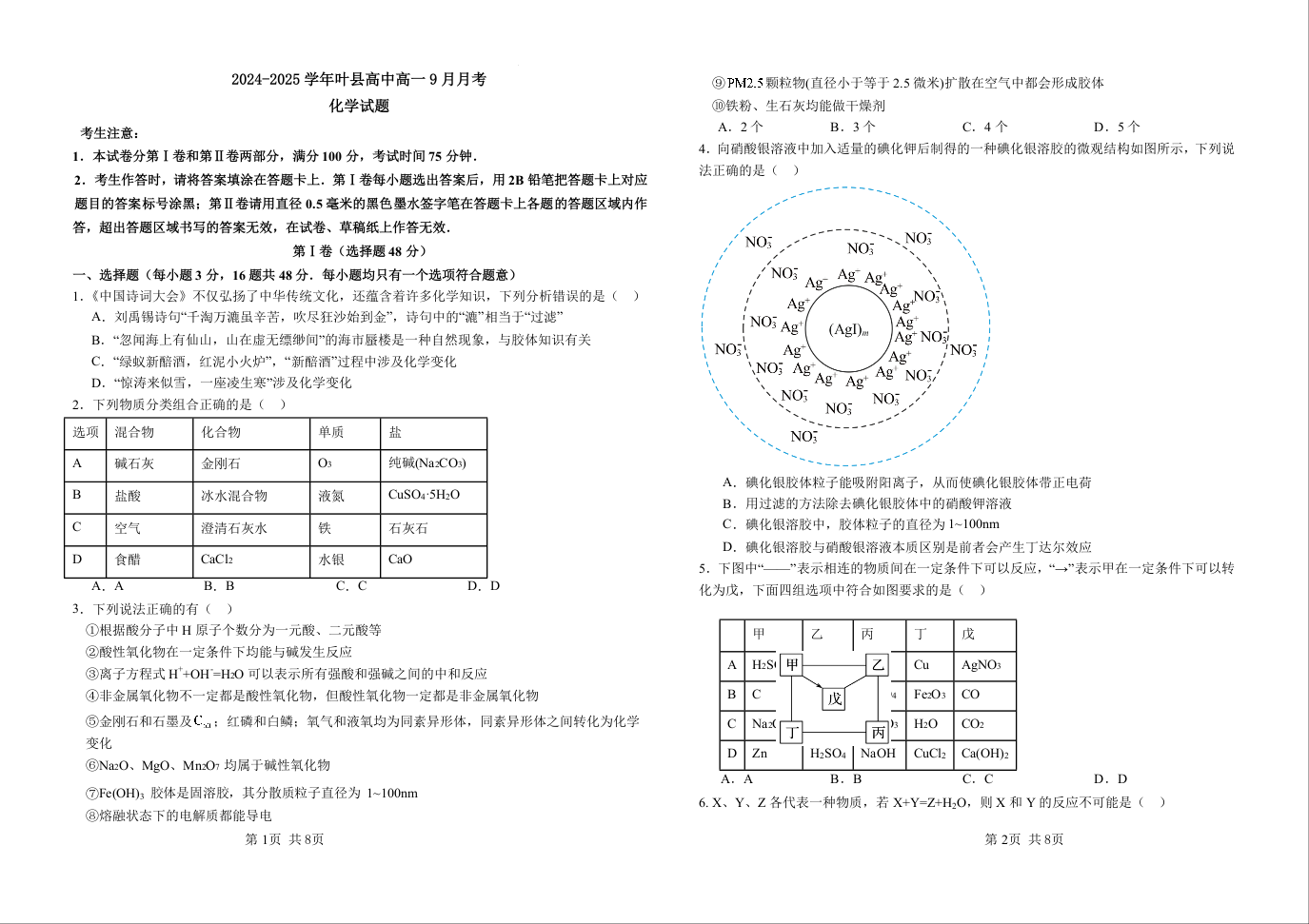 河南省平顶山市2024-2025学年叶县高中高一9月月考化学