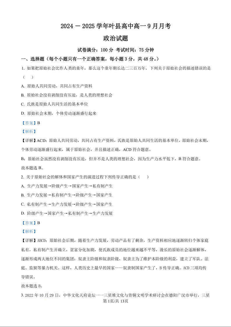 河南省平顶山市2024-2025学年叶县高中高一9月月考政治(解析版)