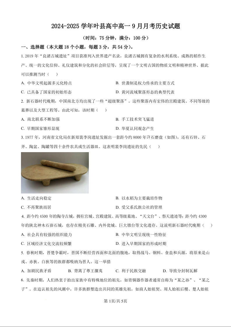 河南省平顶山市2024-2025学年叶县高中高一9月月考历史(原卷版)