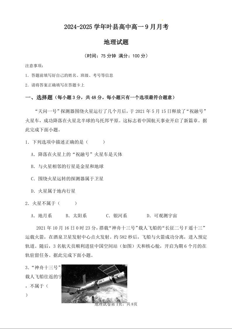 河南省平顶山市2024-2025学年叶县高中高一9月月考地理