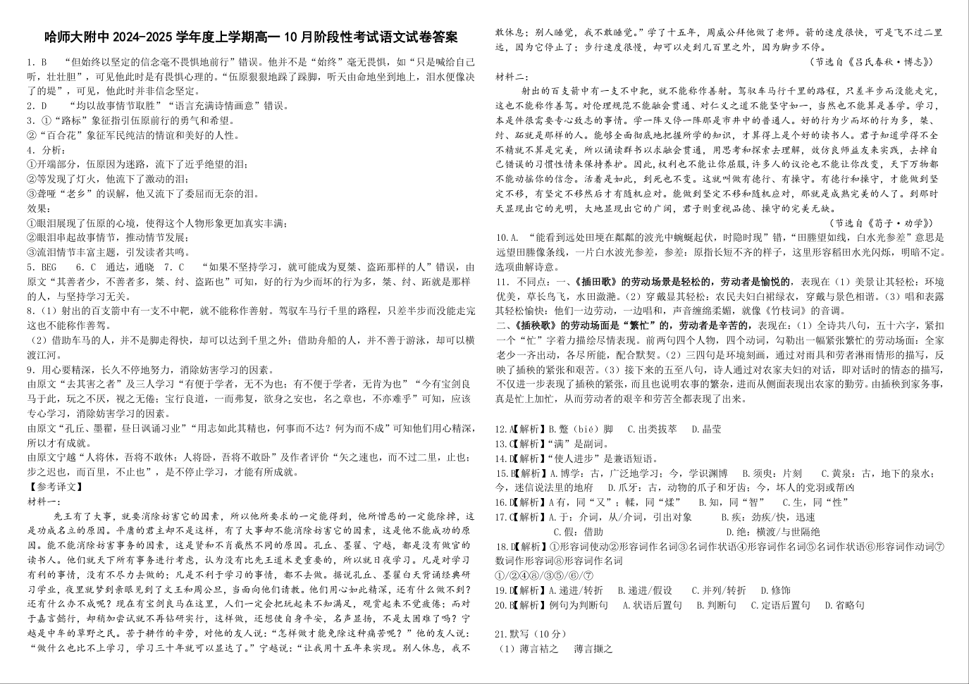 黑龙江省哈师大附中2024~2025学年度上学期高一10月阶段性考试语文答案