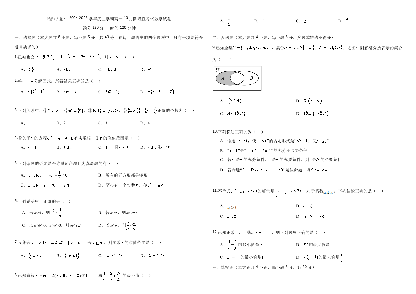 黑龙江省哈师大附中2024~2025学年度上学期高一10月阶段性考试数学