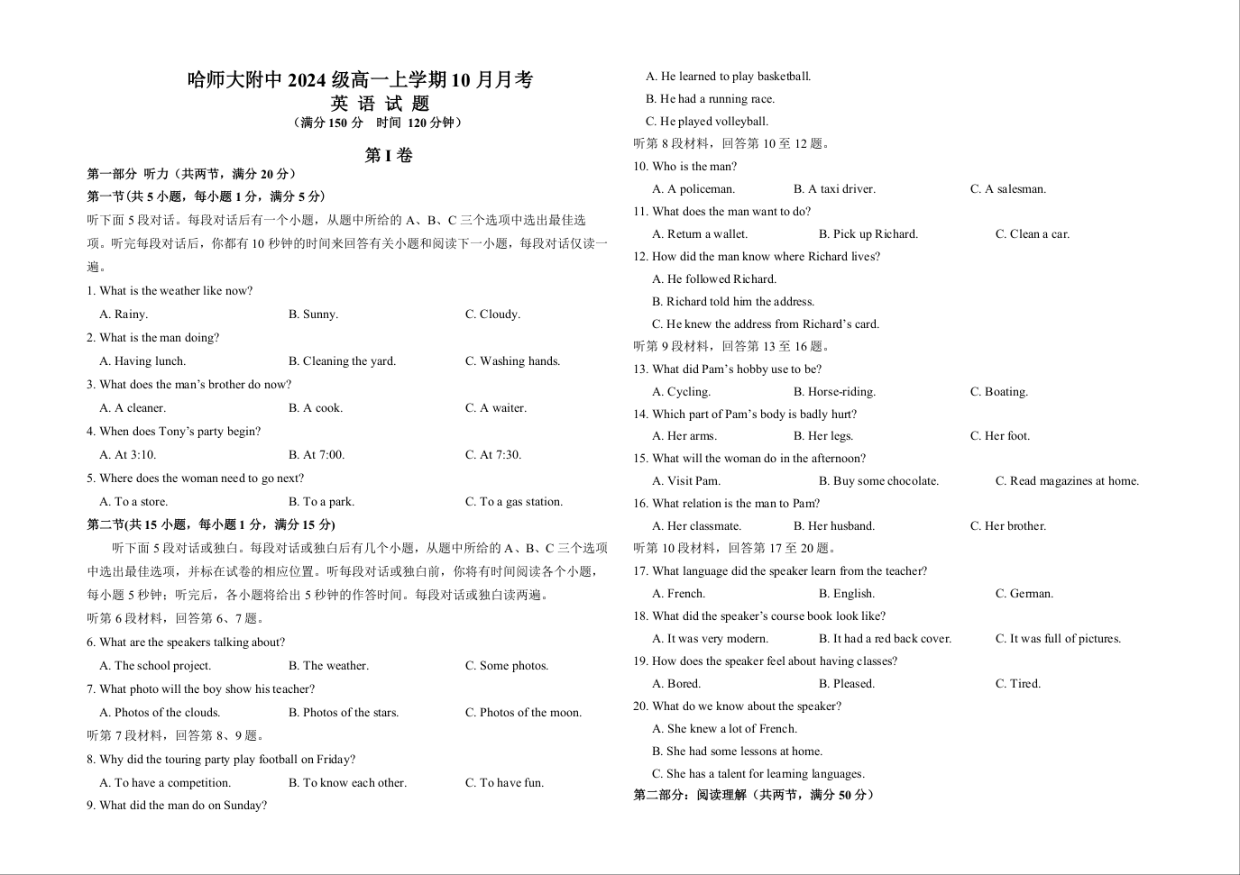 黑龙江省哈师大附中2024~2025学年度上学期高一10月阶段性考试英语