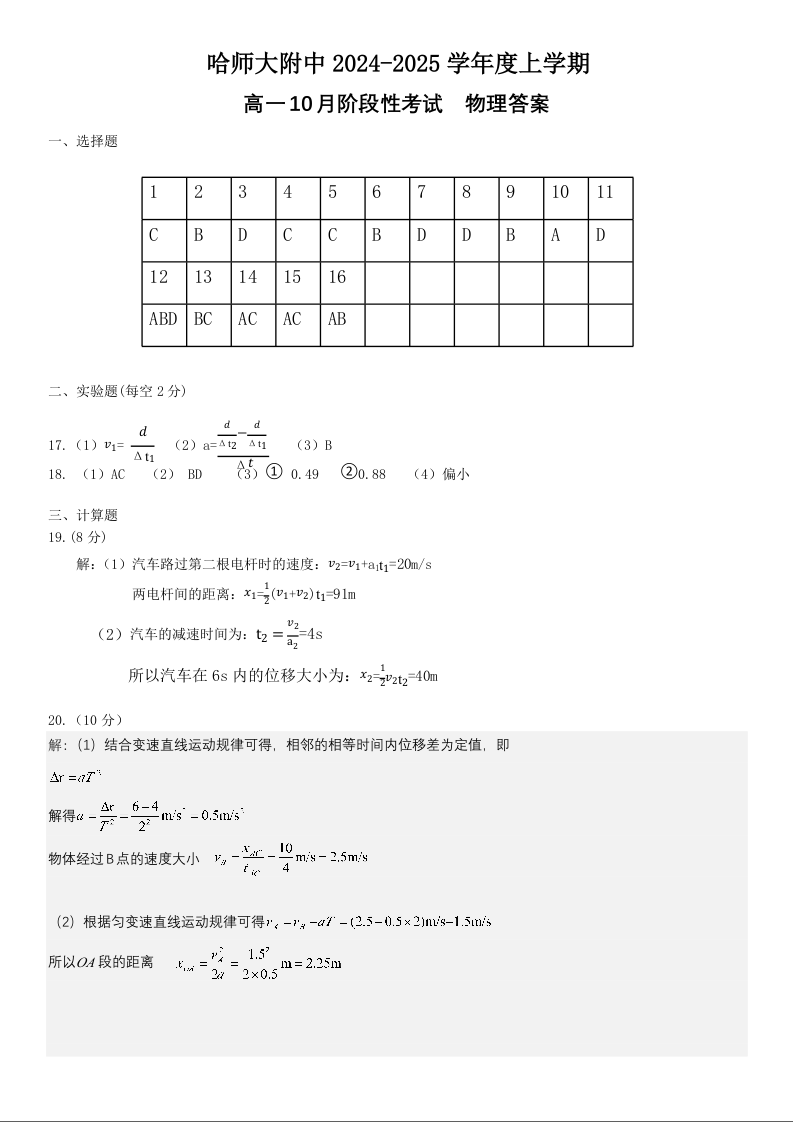 黑龙江省哈师大附中2024~2025学年度上学期高一10月阶段性考试物理答案