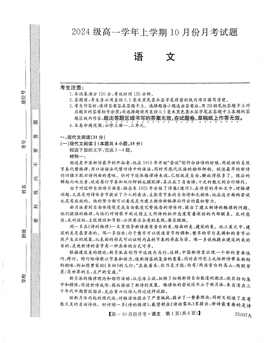 黑龙江省龙东联盟2024级高一学年上学期10月份月考试题语文