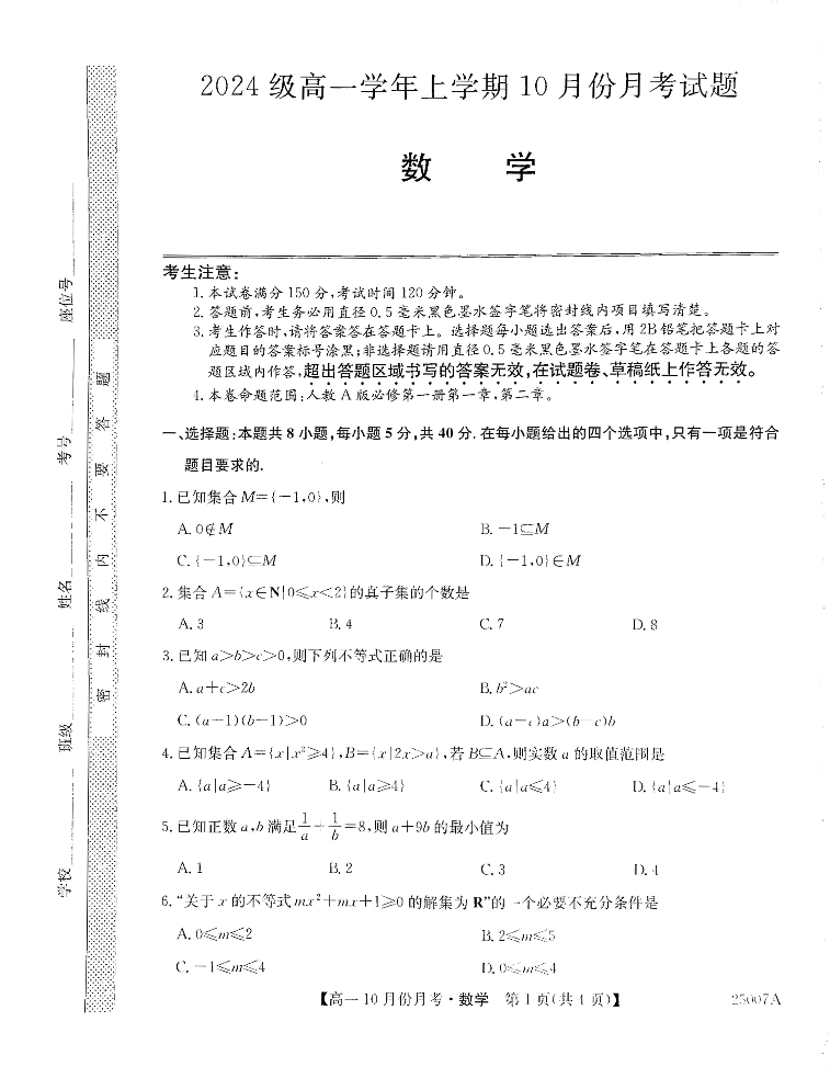黑龙江省龙东联盟2024级高一学年上学期10月份月考试题数学