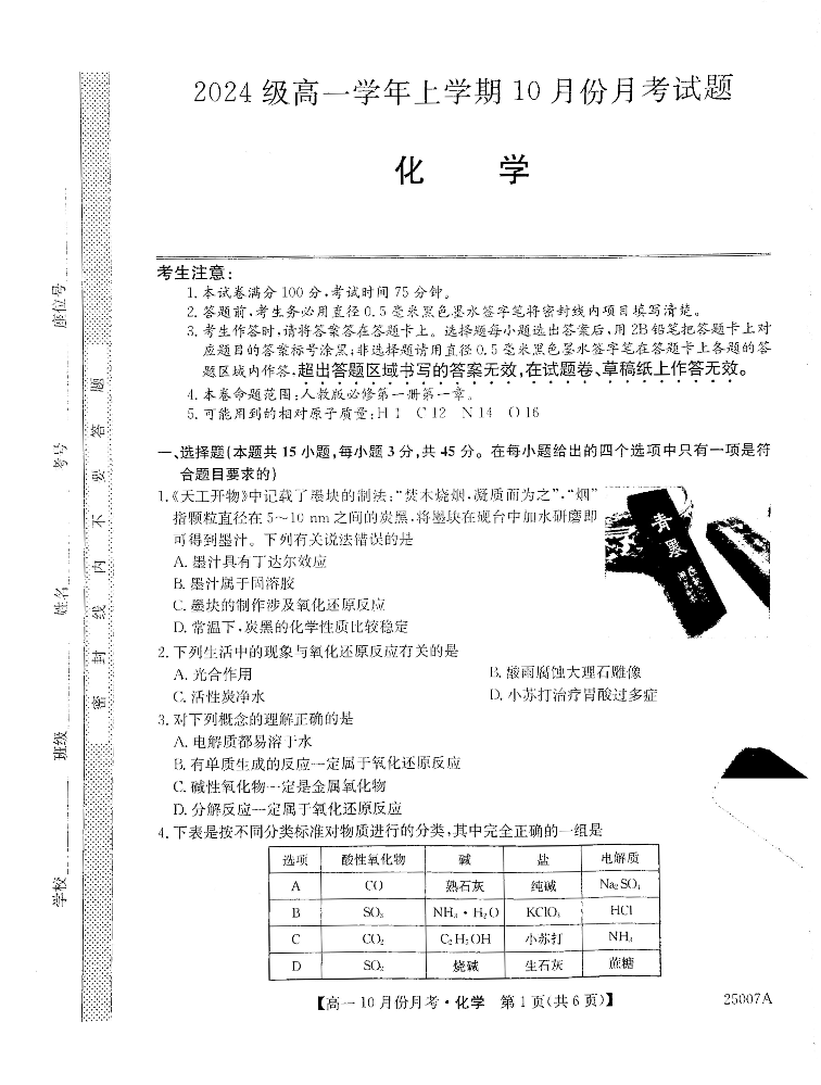 黑龙江省龙东联盟2024级高一学年上学期10月份月考试题化学