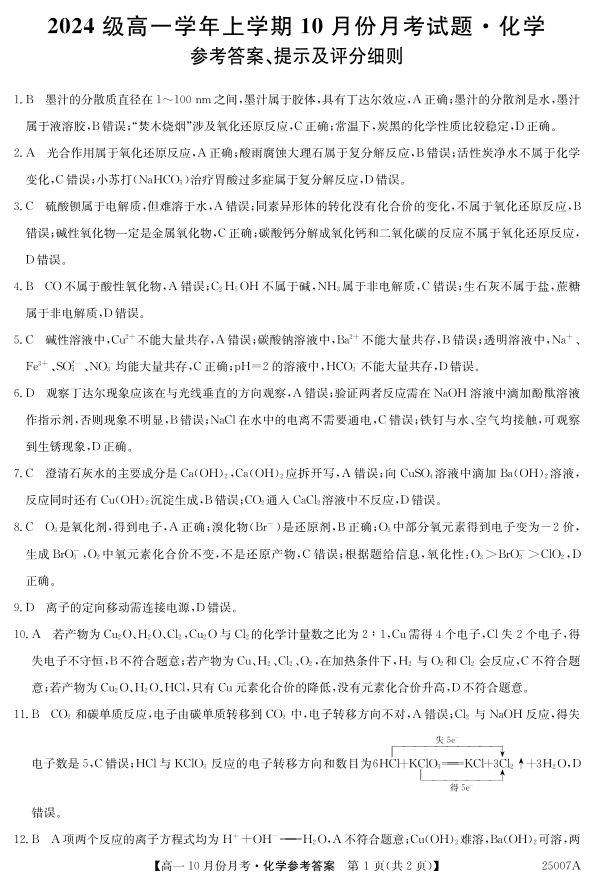 黑龙江省龙东联盟2024级高一学年上学期10月份月考试题化学答案