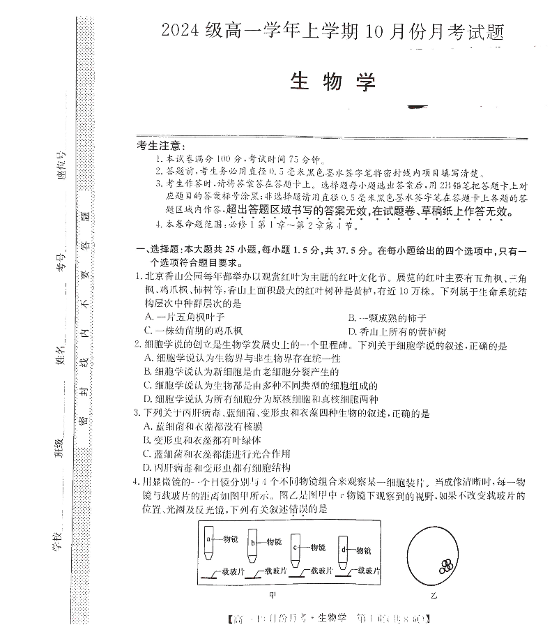 黑龙江省龙东联盟2024级高一学年上学期10月份月考试题生物