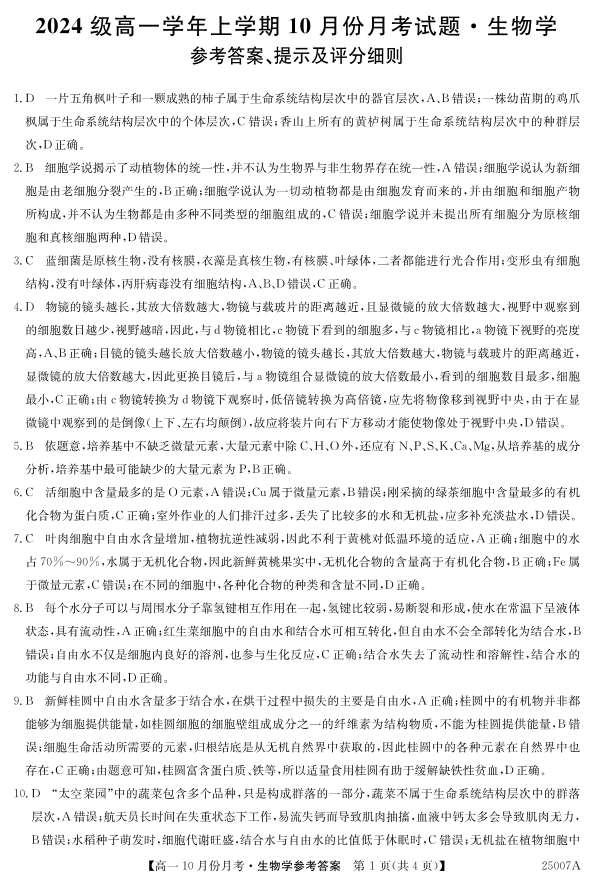 黑龙江省龙东联盟2024级高一学年上学期10月份月考试题生物答案