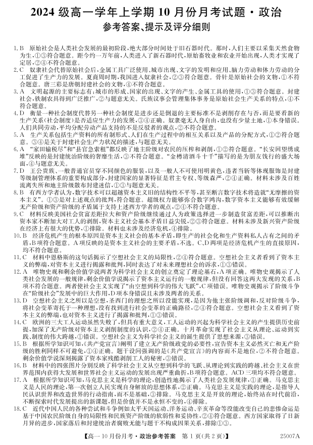 黑龙江省龙东联盟2024级高一学年上学期10月份月考试题政治答案